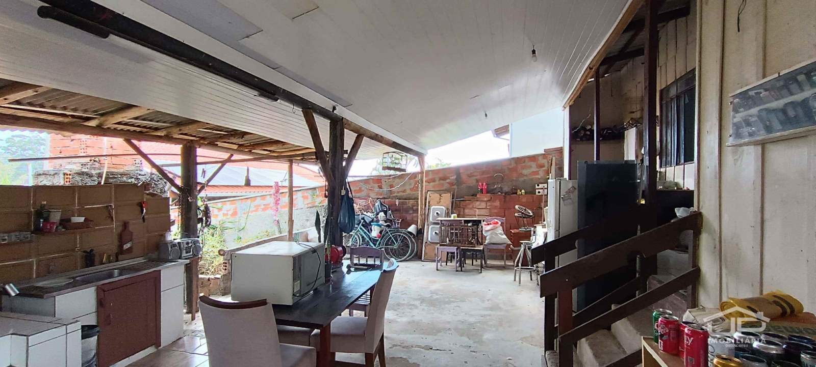 A casa possui estrutura em alvenaria, com divisórias internas em madeira, proporcionando conforto térmico e flexibilidade na organização dos ambientes.